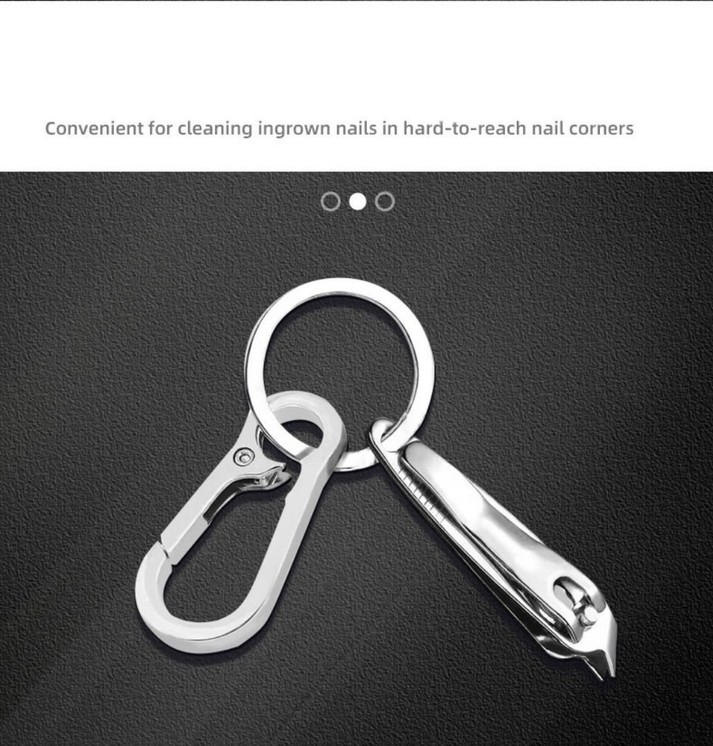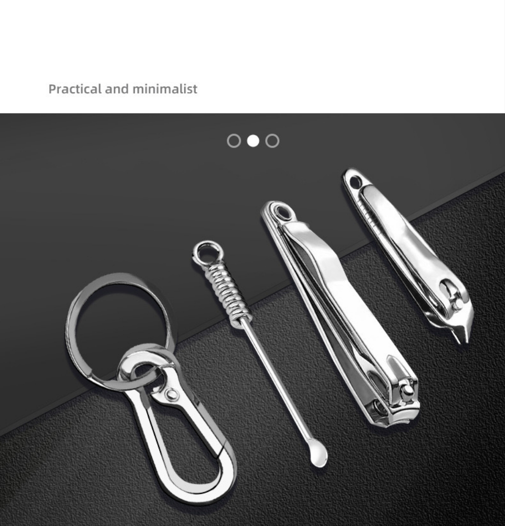 a slant-tip nail clipper.The keychain is made of sturdy metal, with smooth opening and closing. It can be easily hung on a keychain or bag, serving as both a "little helper" for tool storage and a "good companion" for convenient carrying. The ear pick is finely crafted, with a rounded spoon head that fits the ear canal and gently cleans earwax. The large nail clipper has a sharp blade, making it easy to handle daily nail trimming. The slant-tip nail clipper is good at dealing with details such as nail edges, making manicure more comprehensive.